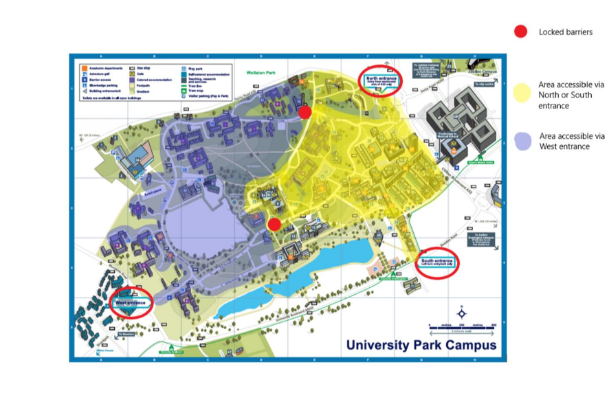 Barriers will be located by Cripps Health Centre and Hallward (on cut through lane between Hallwood and The New Theatre) – Please see map below.